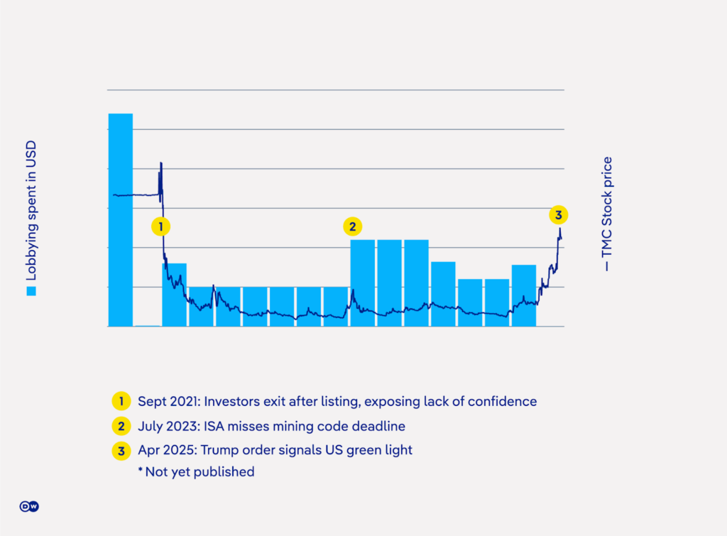 Issues related to Trump’s April executive order are listed by a lobbyist for TMC on its disclosure for the first quarter of 2025. Writing in Deutsche Welle, investigative journalist Serdar Vardar linked TMC’s lobbying spend to key regulatory moments and the company’s publicly traded stock price. TMC appears to have increased its investment in influencing politicians in Washington in mid-2023, when the ISA missed a contested “deadline” to finalize regulations for exploitation following an earlier application by Nauru, where TMC holds a license through NORI.